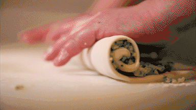 馅料和面结合:取出醒好的面,擀成圆形,将馅料平铺在上面,将面饼卷起,揉成面团,再次将包好馅料的面团擀成圆饼。